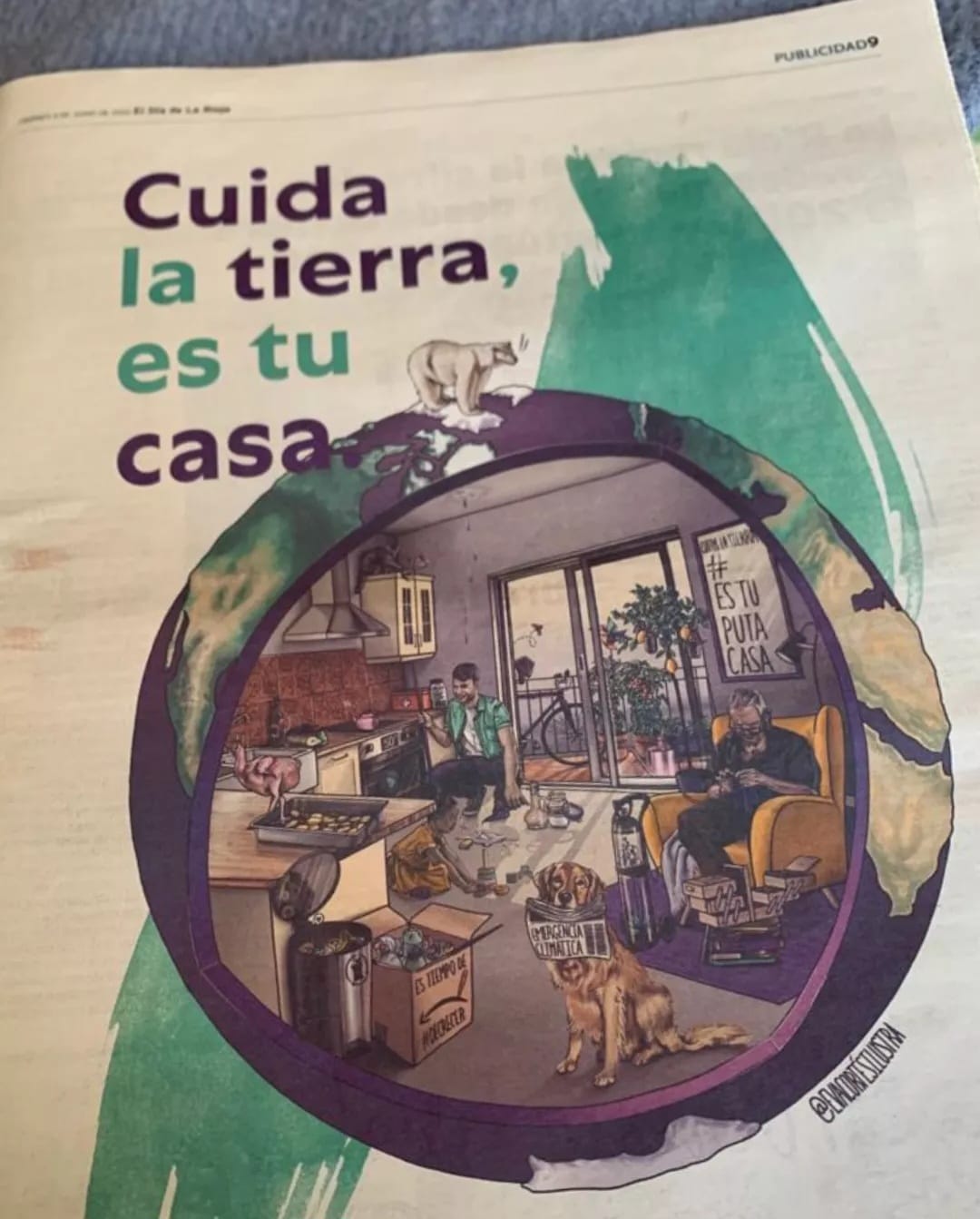 En la ilustración se pueden encontrar multitud de detalles reivindicativos sobre el tema, una persona mayor cosiendo y reparando ropa con un costurero, cuya bombona de oxigeno contiene dentro una planta. A un padre limpiando la casa con vinagre y bicarbonato. Un planeta tierra asándose como un bizcocho en el horno, el pollo asado se escapa de una bandeja en la que estaba preparada con su guarnición (como critica al excesivo e insostenible consumo cárnico). Un gato tirando un reloj de arena (porque se nos acaba el tiempo para revertir el calentamiento global), una bicicleta, tomateras en el balcón, abejas…. y un oso polar en el polo norte cuyo bloque glaciar se derrite y provoca una gotera en casa.