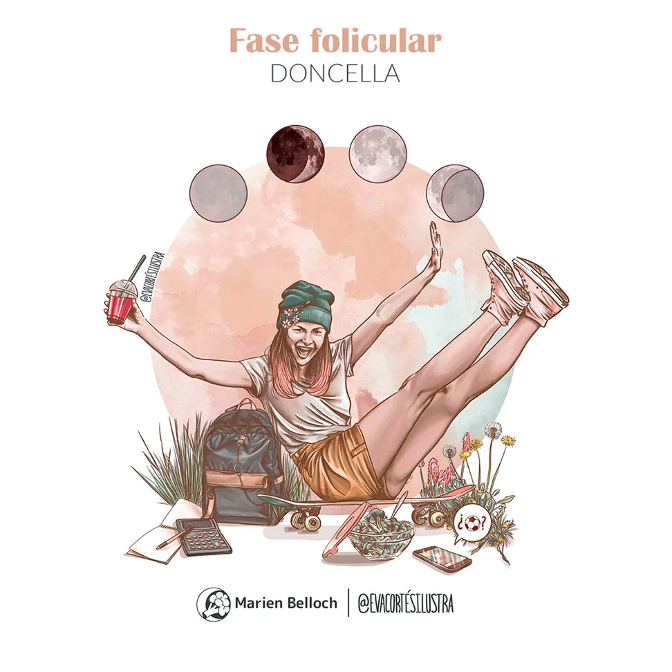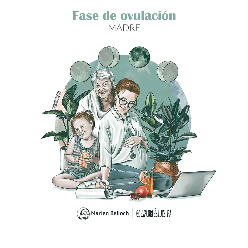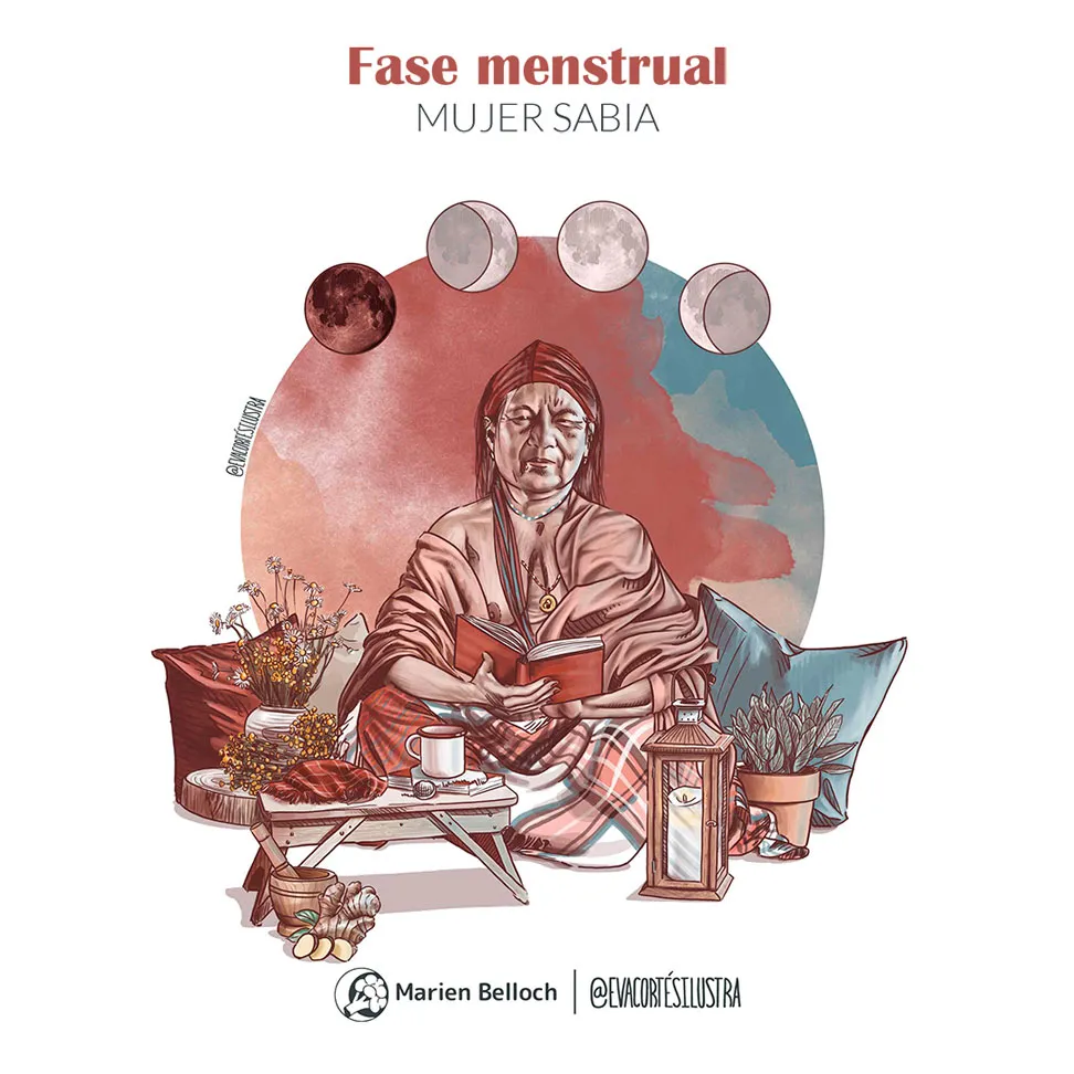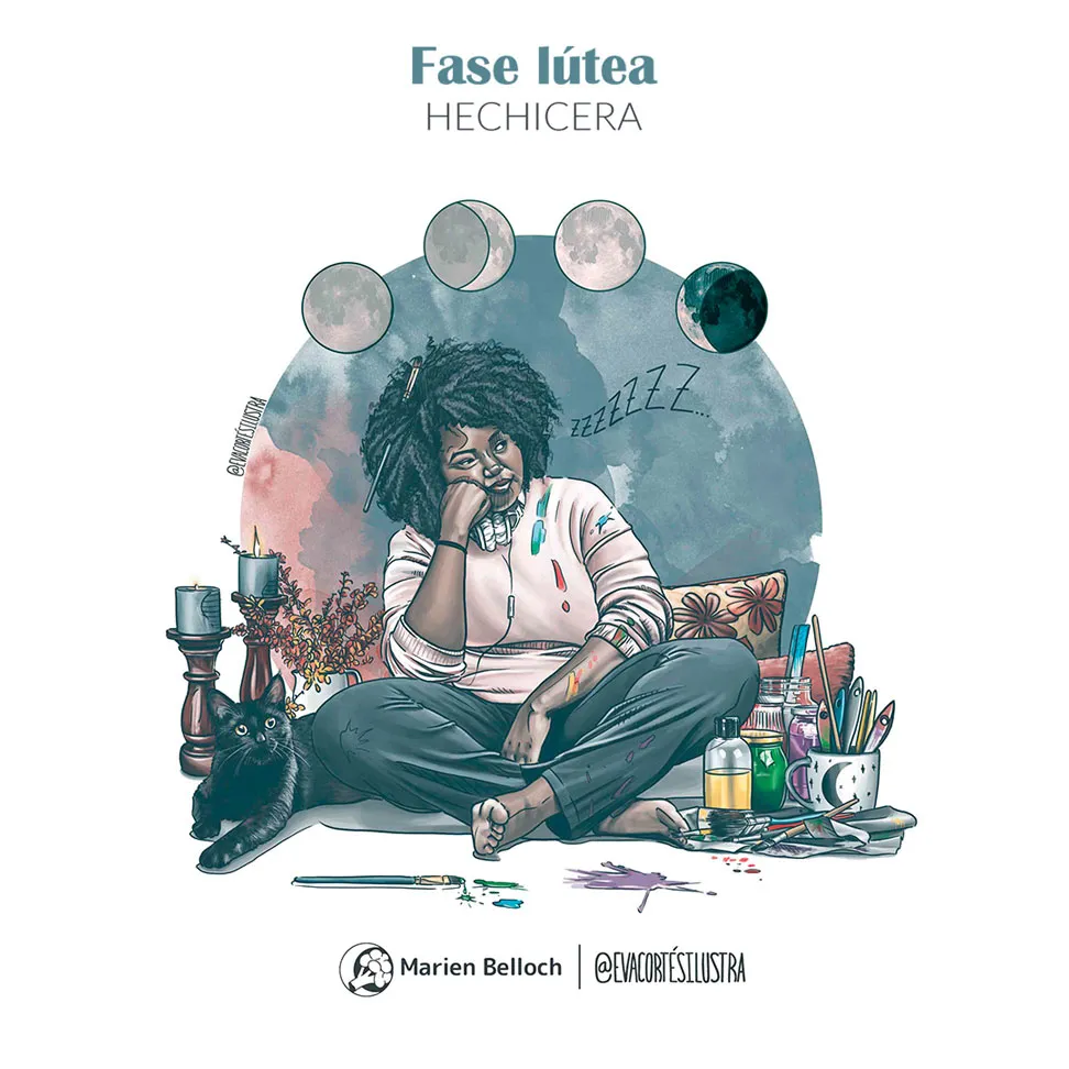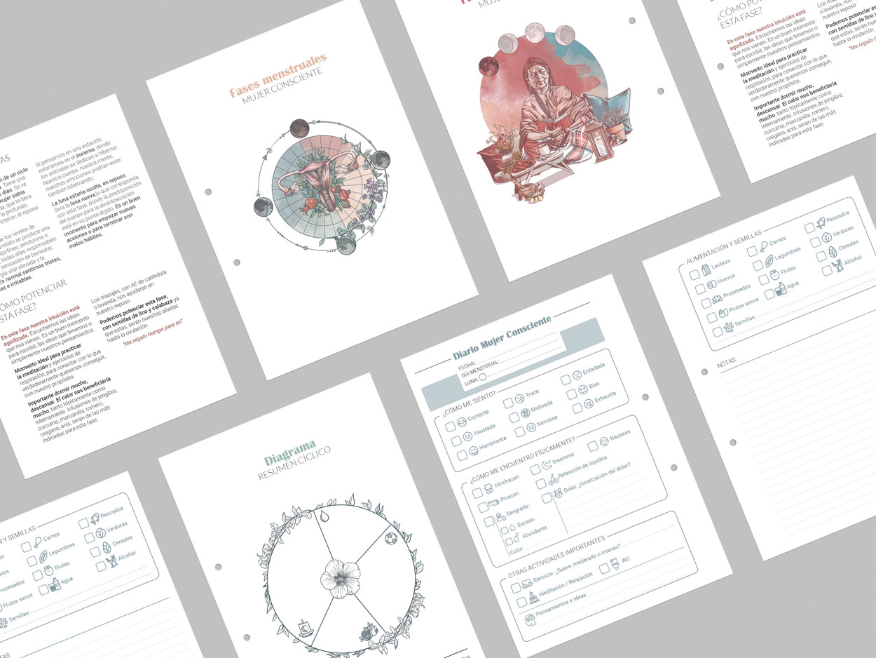Las ilustraciones con más protagonismo en el diario son las que podemos encontrar en la introducción de este, en ellas intentamos desmarcarnos de la estética esotérica y holística con la que se suelen representar las fases del ciclo sin abandonar las metáforas más espirituales que nuestras ancestras usaban para comunicarse con su lado más introspectivo.